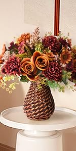 - Made of high-quality silk, these fall artificial roses are not easy to fade or fall off. The rattan bottle is handwoven with premium rattan, providing a natural and realistic look. Perfect for fall decor