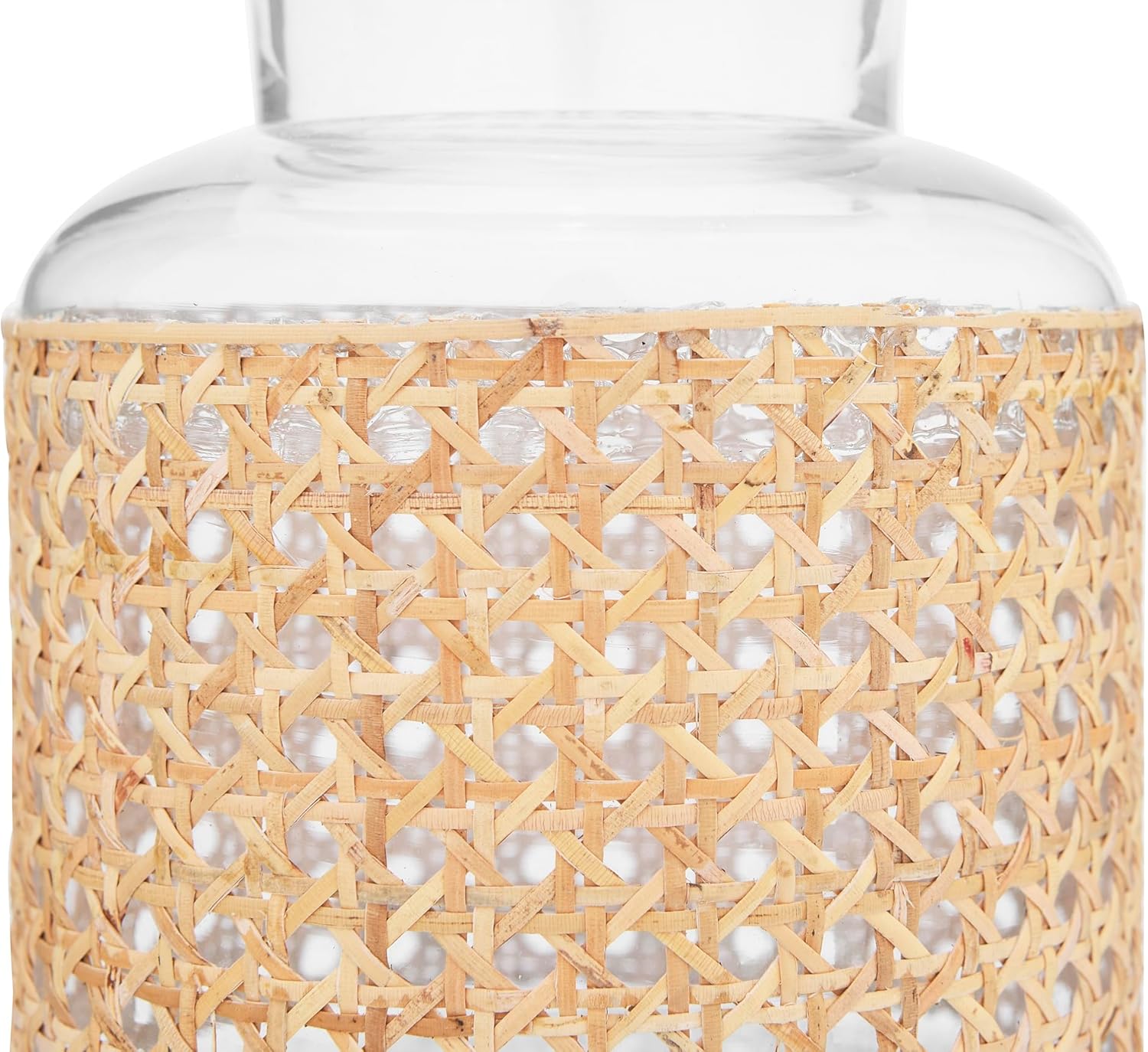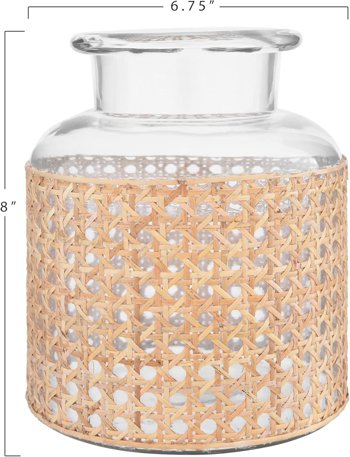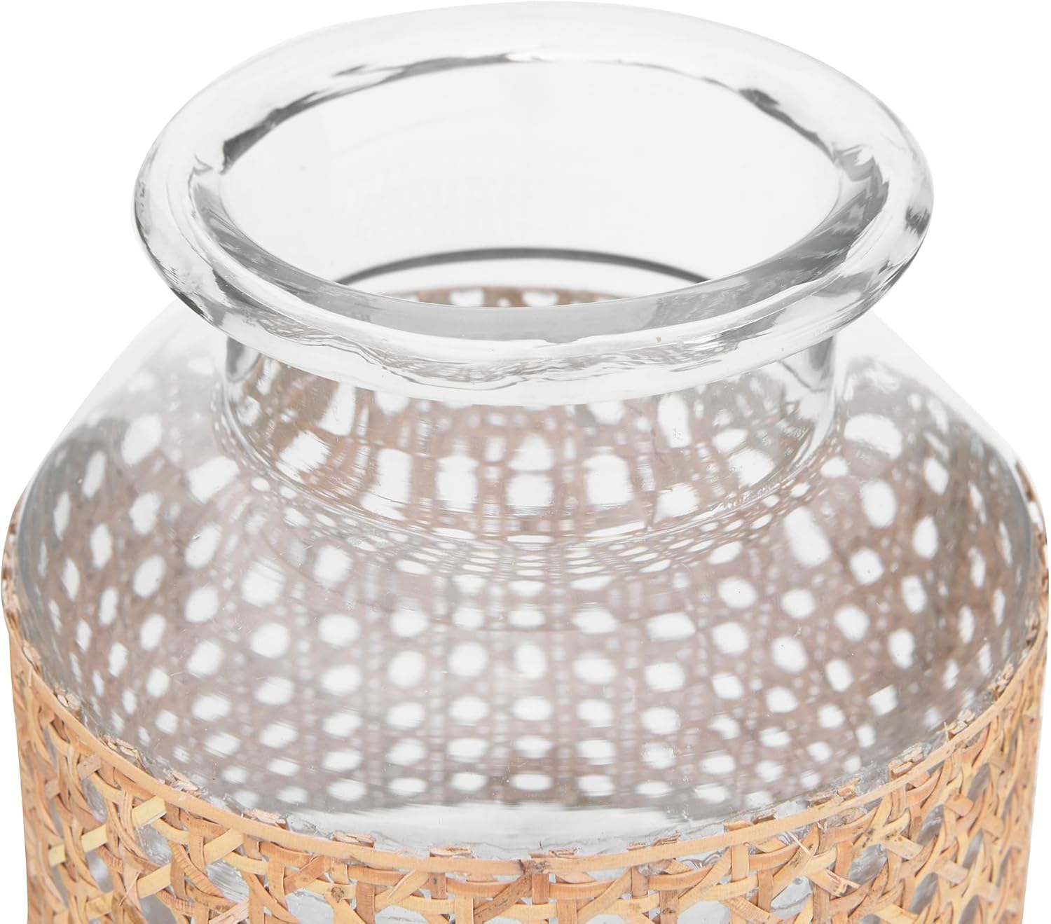 This clear glass vase is decorated with a covering of woven cane. Alone, it is a perfect addition to a shelf or mantel. For a little extra color, fill with a few dried botanicals and display proudly on a tabletop or counter.