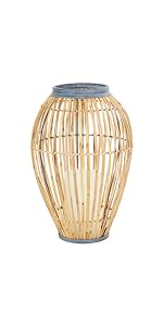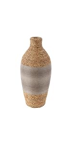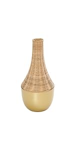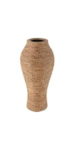 This bohemian vase for home decor is woven with paper string and rattan in a secure pattern along a structured metal frame to ensure long-term use. Oiled brown vase for decoration has a round shape with an open-style frame, handmade with an intricately woven geometric grid pattern and wrapped vase opening. Wipe clean with a dry cloth. Place this brown centerpiece vase on a console table to display fresh greenery or use it as a striking decorative accent piece. Designed with felt or rubber stoppers at the base that prevent scratching furniture and table tops, as well as sliding around. This item ships in 1 carton. Rattan vase makes a great gift for any occasion. Due to the handmade nature of this item, no two will be alike, there will be slight differences in shape, size, and color. Suitable for indoor use only. This item ships fully assembled in one piece. This is a single brown colored vase. Bohemian style. Vase has a 1.10 in mouth opening.