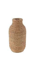 This bohemian vase for home decor is welded with iron and wrapped with braided seagrass adding an interesting visual element to the overall look. With its unique round shape, braided stripes and two-toned rich brown hue, this textured brown vase for decoration brings a bohemian flair to your space. Wipe clean with a dry cloth. Use this brown centerpiece vase as a display piece in your living room or to hold your favorite dried flowers and plants. Designed with felt or rubber stoppers at the base that prevent scratching furniture and table tops, as well as sliding around. This item ships in 1 carton. Seagrass vase makes a great gift for any occasion. Due to the handmade nature of this item, no two will be alike, there will be slight differences in shape, size, and color. Suitable for indoor use only. This item ships fully assembled in one piece. This is a single brown colored vase. Bohemian style. Vase has a 2.50 in mouth opening.