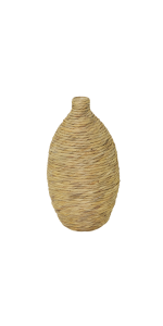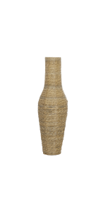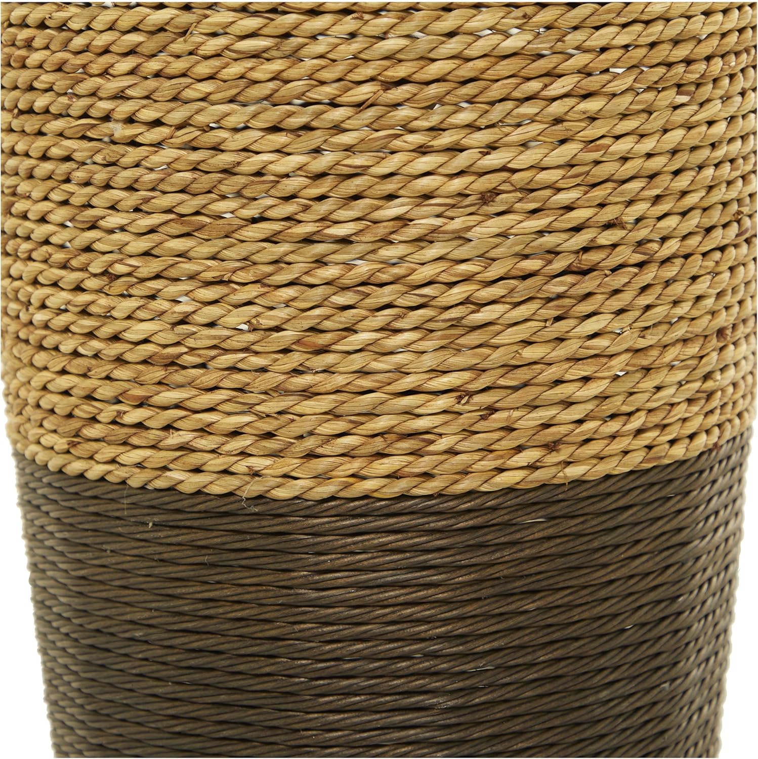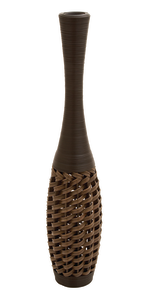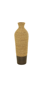 An intricate seagrass weave overlay encases the welded iron and resin body of this bohemian vase for home decor. The tall silhouette with weave pattern accentuates the urn shape of this textured brown vase for decoration. Wipe clean with a dry cloth. Display this brown centerpiece vase as a focal point in your bedroom or living room area to give your indoor aesthetics a rustic upgrade. Designed with felt or rubber stoppers at the base that prevent scratching furniture and table tops, as well as sliding around. This item ships in 1 carton. Due to the handmade nature of this item, no two will be alike, there will be slight differences in shape, size, and color. Suitable for indoor use only. This item ships fully assembled in one piece. This is a single brown colored vase. Bohemian style. Vase has a 3 in mouth opening.