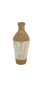 Intricately wrapped seagrass is twisted and coiled around the bohemian vase for home decor, with vertical bamboo strips attached to the metal support frame at the center. Textured brown vase for decoration accentuates a round tapered body with curved neck, round mouth opening and stripes pattern. Wipe clean with a dry cloth. Get creative with your display by adding long stem arrangement or mix and match with other vases for unique mix of texture and color. Create depth and form onto your space by displaying this beautifully crafted vase. Throw some dried pampas grass or display this brown centerpiece vase as a focal point in your bedroom or living room area to give your indoor aesthetics a rustic upgrade. Designed with felt or rubber stoppers at the base that prevent scratching furniture and table tops, as well as sliding around. This item ships in 1 carton. Due to the handmade nature of this item, no two will be alike, there will be slight differences in shape, size, and color. Suitable for indoor use only. This item ships fully assembled in one piece. This is a single brown colored vase. Bohemian style. Vase has a 3 in mouth opening.