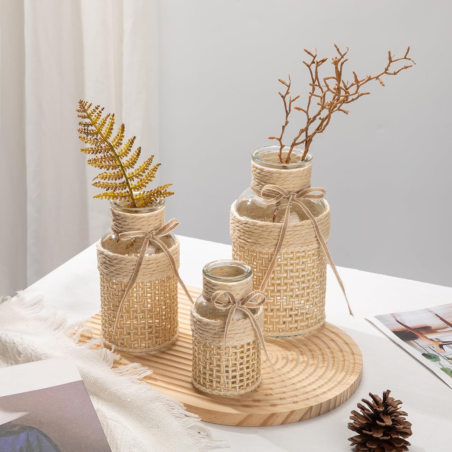 Hollyone 3Pcs Flower Vase Glass Vase with Cotton Rope Cover Woven Glass Vase Decorative Flower Bottle Modern Vase for Table Centerpiece Farmhouse Wedding Home Decor
