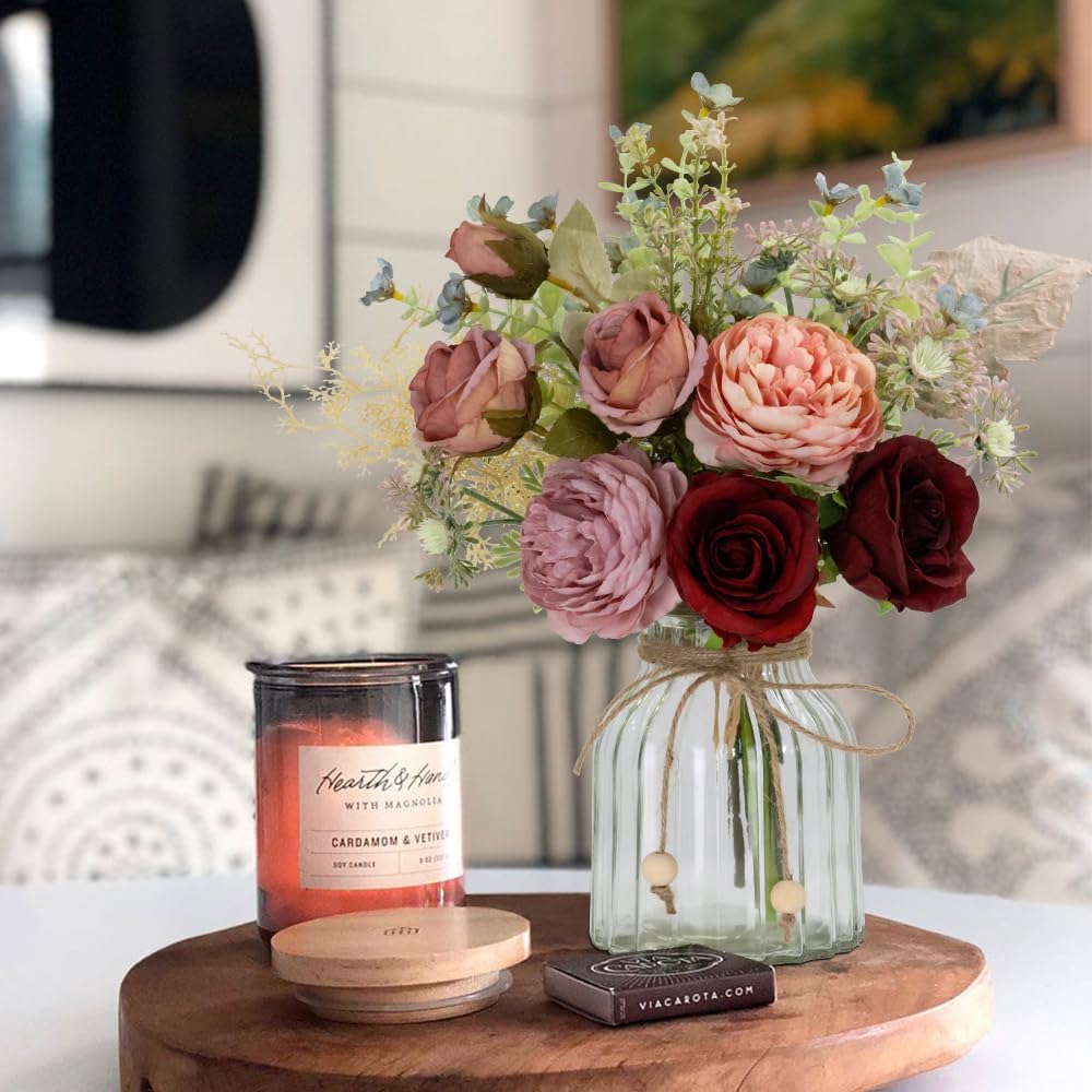 LESING Artificial Rose Flowers Bouquet with Glass Vase Wedding Flower Centerpieces Tabletop Flower Arrangements